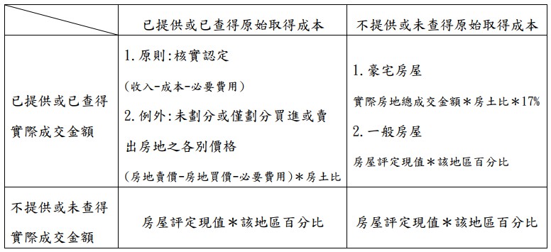 無論是納稅義務人主動提供,或稽徵機關查得,這個時候該如何申報,要視收入跟成本是否均有劃分房屋跟土地個別的價格,分成二種情況