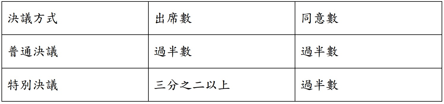 這個過半數出席、過半數同意的決議方式,我們稱為普通決議,相反地,「本法另有規定」就是相對於普通決議而言,我們稱為特別決議,門檻較高,一般而言董事會普通決議與特別決議的出席及同意數如下表一