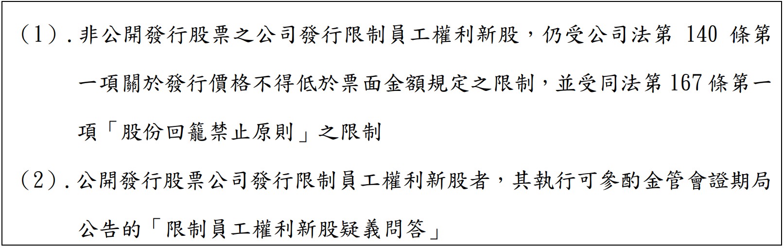 補充說明者係,限制員工權利新股(或稱限制型股票),民國100年引進之初,自公開發行股票公司先行,俟運作一定期間後,再考慮擴大適用範圍。迄今已過數年,企業亦有要求放寬至非公開發行股票公司,準此,民國107年公司法大修時,將適用範圍放寬至非公開發行公司