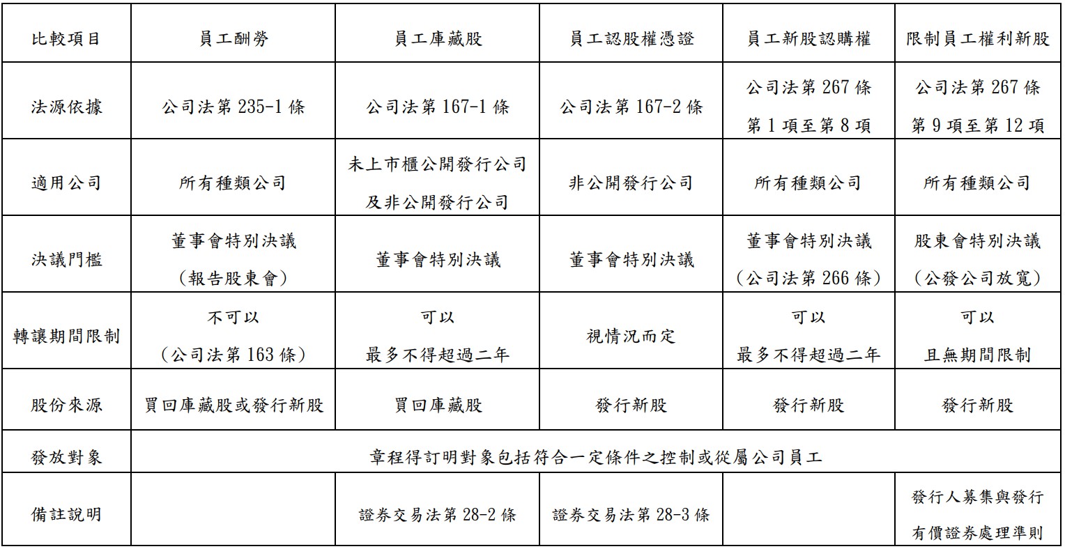 公司法第267條第九項規定:「公司發行限制員工權利新股者,不適用第一項至第六項之規定,應有代表已發行股份總數三分之二以上股東出席之股東會,以出席股東表決權過半數之同意行之」,由此可見,五大員工獎酬工具中,只有限制員工權利新股,程序是股東會特別決議,其他均為董事會特別決議