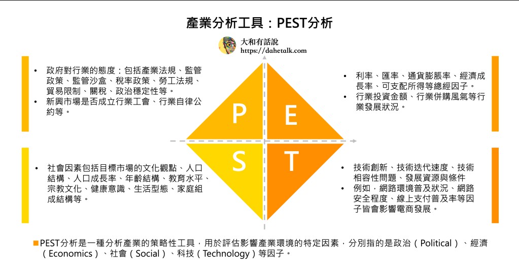 P(Political)指的是政府對行業的態度,包括監管法規、貿易政策、稅率政策、政治穩定性等等。E(Economics)是指包括利率、匯率、經濟成長、通貨膨脹率、失業率等經濟因素。S(Social)著重於社會與文化因素,包括人口結構、生活方式、教育水平、健康意識、文化等等。最後則是T(Technology),會考慮到技術的創新、迭代速度、相容性、發展瓶頸等等。