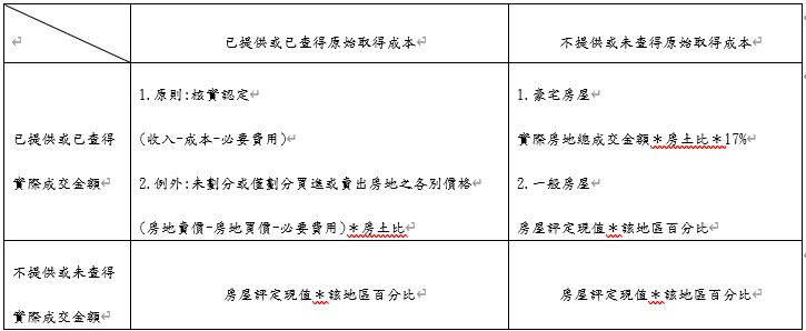 簡而言之,其劃分點在於成交價格(收入面)與原始取得成本(成本面)等有無辦法取得(不管是所得人主動提供或稽徵機關被動查得),分為四個象限,各有其計算房屋財產交易所得之方式,這個部分之前有論述過,在此不多加著墨。