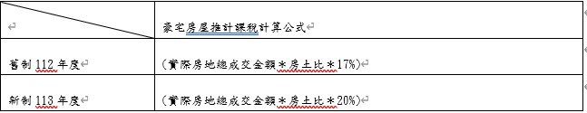 如前所述,在舊制規定下,假設稽徵機關僅查得或納稅義務人僅提供交易時之實際成交金額,而無法證明原始取得成本,並符合豪宅房屋之門檻時,其計算方式為(實際房地總成交金額*房土比*利潤率17%),而這個利潤率在新制下提高為20%,如下對照表: