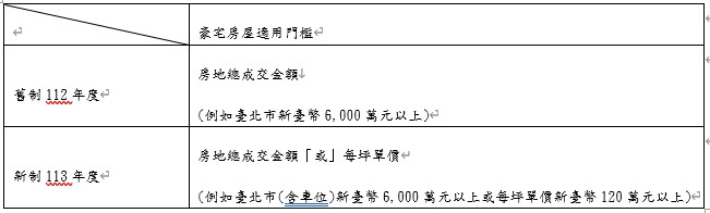 在舊制規定下,所稱豪宅房屋之門檻,係依房地坐落地區,分別設有金額門檻,達標者為豪宅房屋之範疇,在新制下除原本的金額門檻外,加入第二個門檻標準為「每坪單價」,兩者只要符合其一,即適用豪宅房屋之規定,如下對照表:
