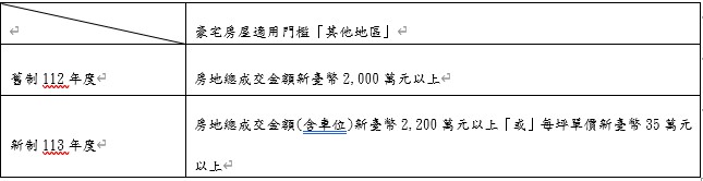 延續剛剛豪宅房屋之適用門檻,在其他地區之金額門檻上,亦從