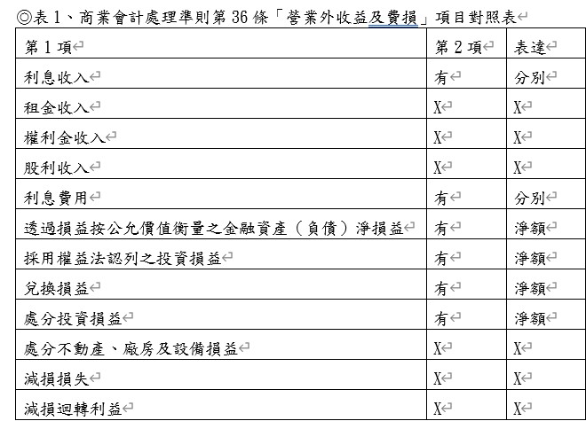 ◎表1、商業會計處理準則第36條「營業外收益及費損」項目對照表