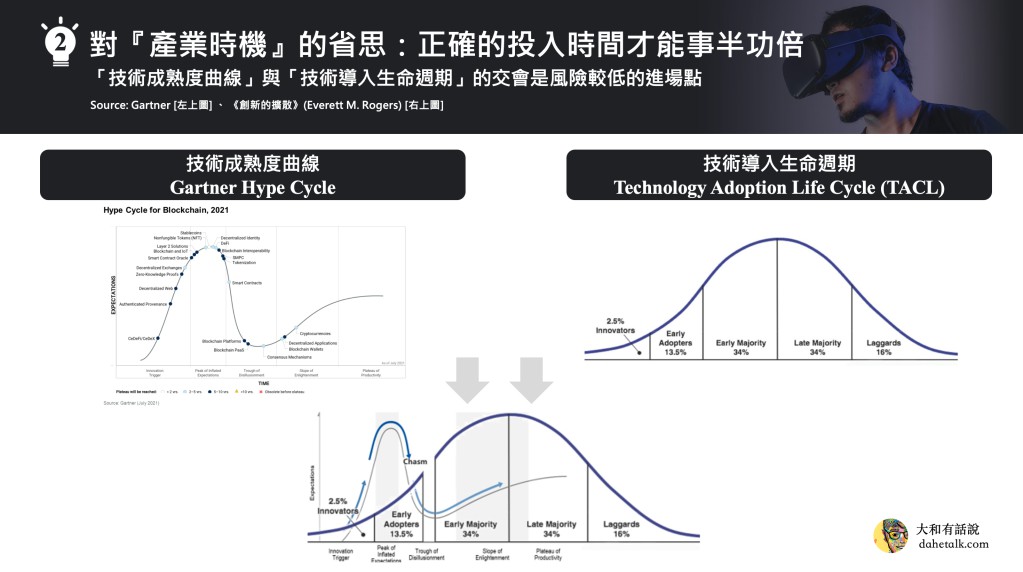 你可以想像左邊這張圖是技術的供給,右邊這張圖是技術的需求,而兩張圖的交會點,洽好是在「大眾期待跌落谷底」以及「早期採用者」的那個階段。因此,如果要選擇一個風險較低的進入時機點,這個交會處便是「技術風險已大幅降低」且「市場即將大量普及」的甜蜜點。