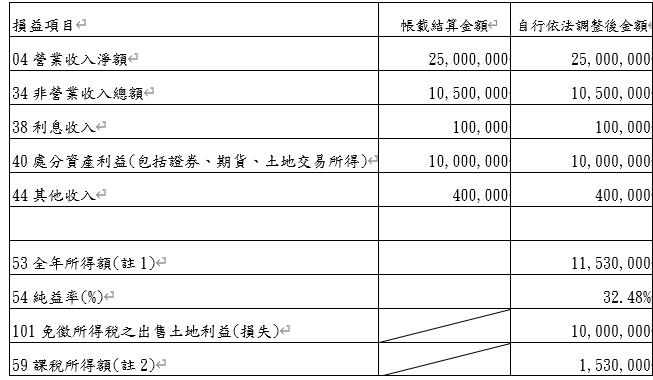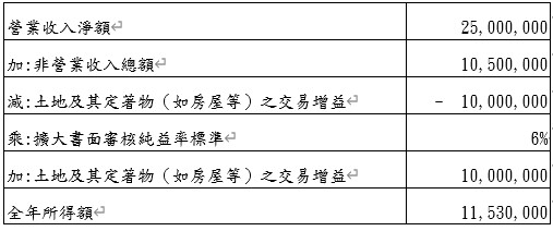 (營業收入淨額+非營業收入總額-房地交易所得)*擴大書審純益率標準+房地交易所得-101免徵所得稅之出售土地利益(損失)