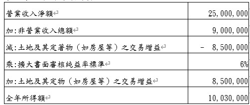 「二、凡全年營業收入淨額及非營業收入【不包括土地及其定著物(如房屋等)之交易增益、所得稅法第四條之四規定之房屋使用權、預售屋及其坐落基地、股份或出資額之交易增益暨依法不計入所得課稅之所得額】合計在新臺幣三千萬元以下之營利事業」…