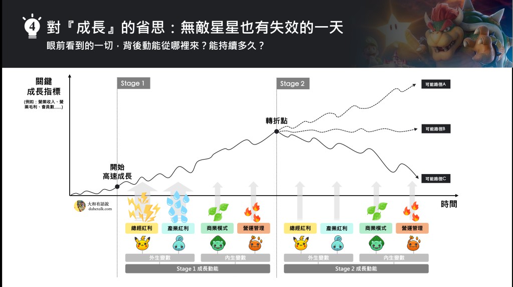 延續上一個省思「問號磚頭裡,藏有無敵星星」,我的第四個省思是「無敵星星也有失效的一天」。也就是,當我們看到那些光鮮亮麗的財報時,要隨時思考現在成長的背後,柴火到底從何而來,又能持續多久?