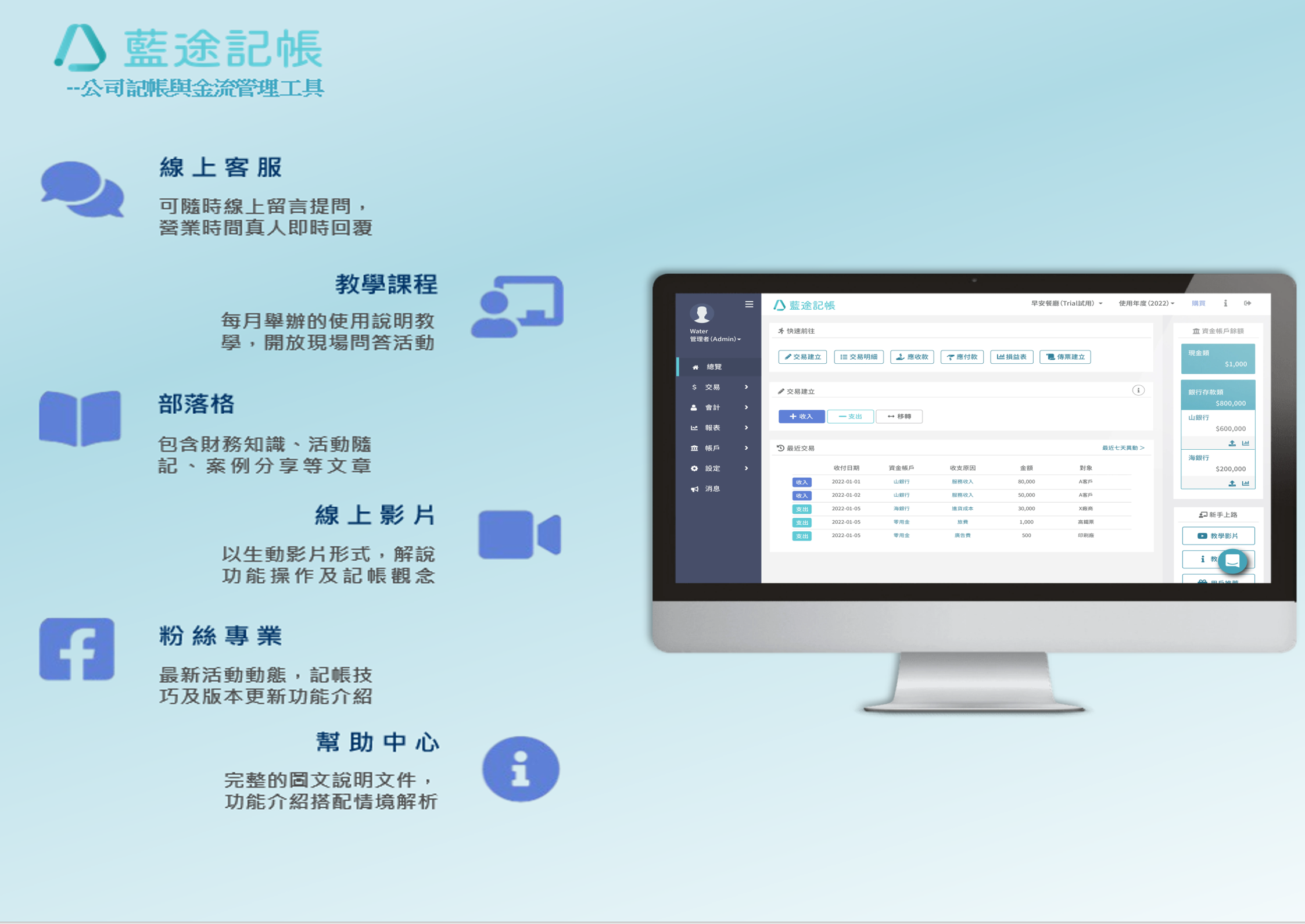交易建立、掌握餘額、三大財務報表即時更新、專案與部門獨立損益、未來金流預估分析、權限劃分與外部協作