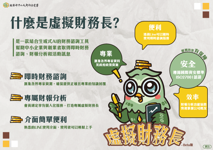 結合生成式AI的財務諮詢工具,匯集各界專家資源,確保提供正確且專業的知識回覆,以協助中小企業與創業者24小時均可取得最即時的財務諮詢、財報分析與活動訊息。